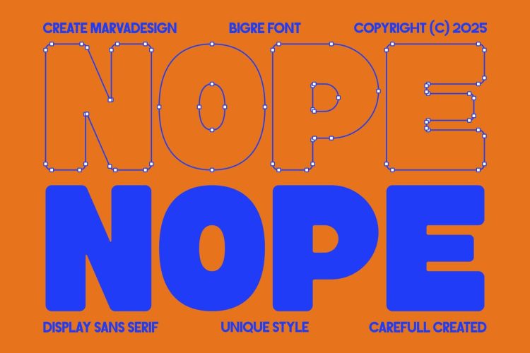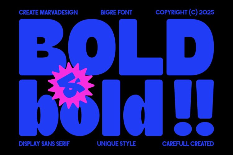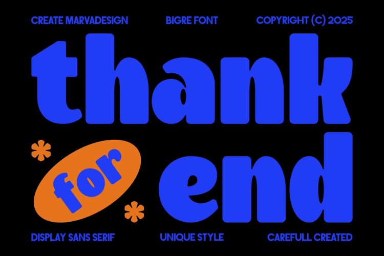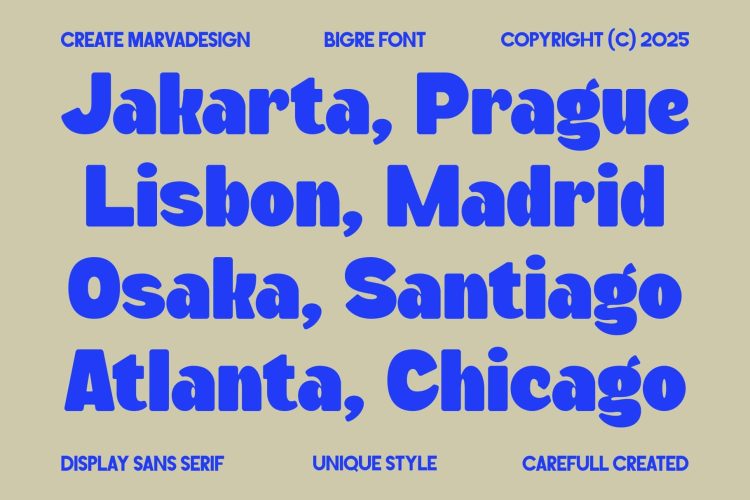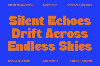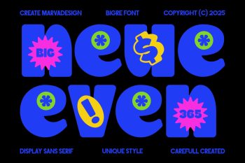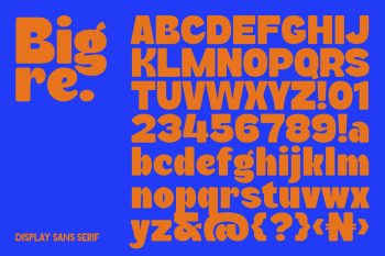 Bigre is a contemporary display sans serif typeface that takes its name from the fusion of “Big” and “Ogre,” reflecting its massive presence and bold personality. With oversized proportions, smooth curves, and playful quirks, Bigre balances power with a sense of fun. Each letterform is carefully crafted to evoke a chunky, almost monstrous strength while still retaining a friendly and approachable charm. The exaggerated terminals and rounded counters contribute to its unique character, making it stand out from conventional geometric sans serifs.