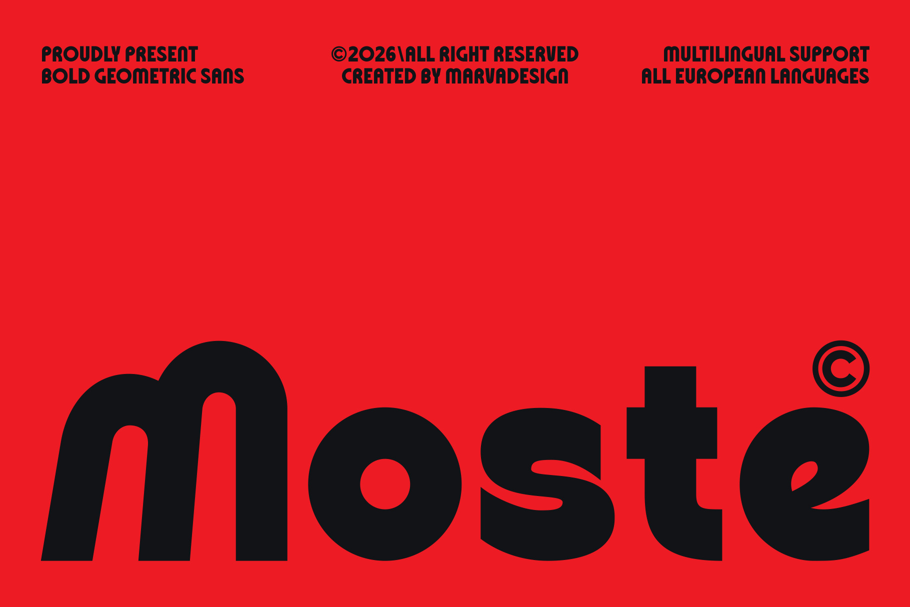 Moste is a bold geometric sans-serif font that blends modernist structure with a distinctive contemporary attitude. Characterized by thick, confident strokes and softly rounded terminals, Moste delivers a strong visual presence without feeling rigid. Its letterforms are clean and highly legible, yet subtly playful seen in the unique curves, open counters, and slightly unconventional proportions that give the typeface a recognizable personality. This balance makes Moste feel both modern and expressive.